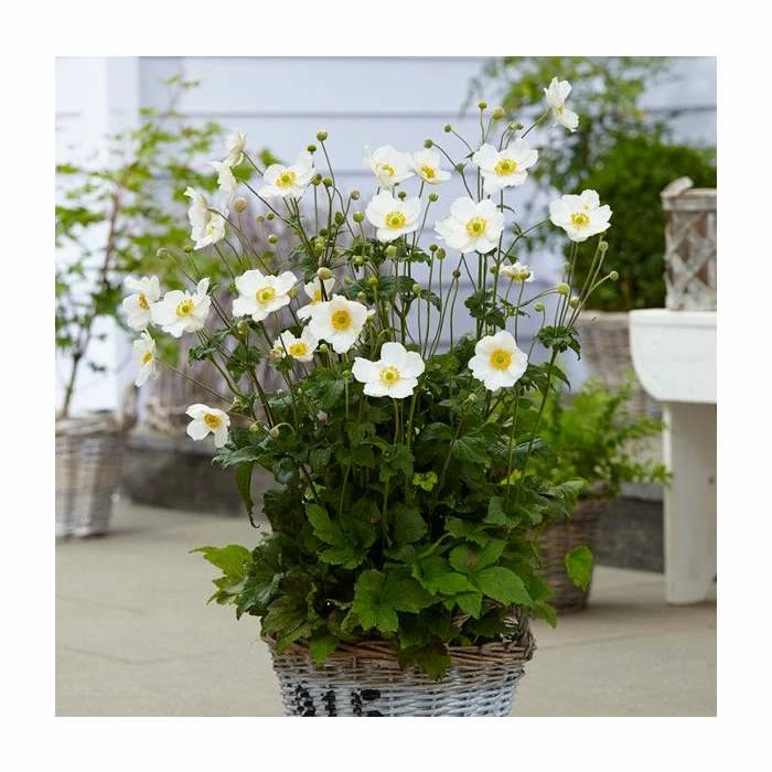 Flowering during the summer months, this striking variety features the classic white petals that encircle a vibrant yellow centre. The tall stalks of this plant will add height to a border, making it a great plant for an architectural display. This variety also carries the Royal Horticultural Society’s ‘Award of Garden Merit’; affirming its good form and constitution, beautiful flowers and foliage, easy to grow nature, and excellent resistance to pests and disease.</anemone<>